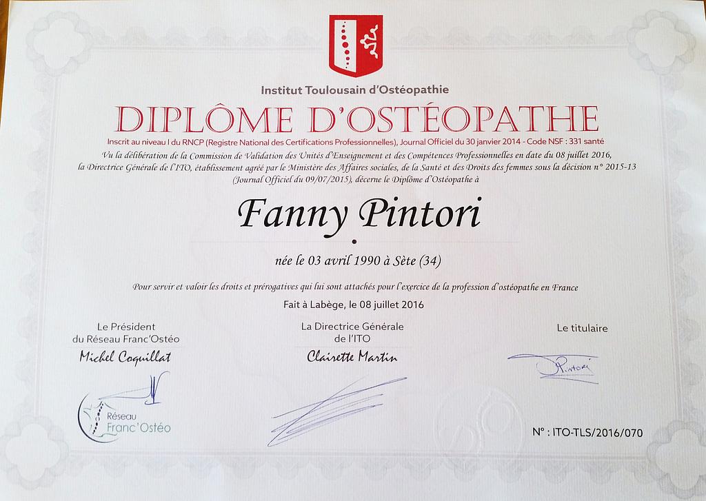 Cabinet d'ostéopathie à Mèze Votre ostéopathe près de Marseillan et Montagnac Fanny Pintori vous accueille dans son cabinet d' ostéopathie situé dans le Domus Médica à Mèze. Elle est Ostéopathe diplômée de l'Institut Toulousain d'Ostéopathie, école reconnue pour son enseignement de qualité et agréée par le Ministère de la Santé, de la Jeunesse et des Sports. Diplôme enregistré au niveau 1 au RNCP, Registre National des Certifications Professionnelles. Cursus en 5 ans répondant en tous points au référentiel préconisé par le Ministère de la Santé : Pratique clinique Pratique ostéopathique...